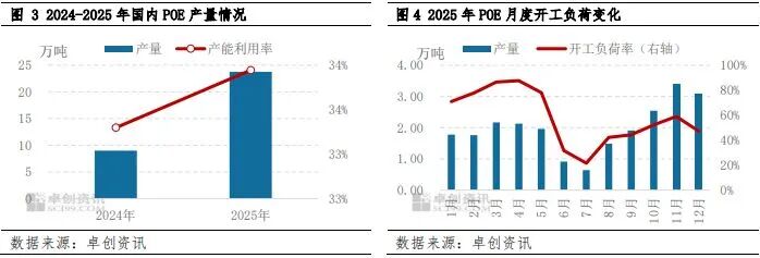 得益于POE新产能的释放及装置稳定性的提升,POE产量明显提升,据卓创资讯(301299)统计,2025年POE国内产量在23.76万吨,较2024年增加14.77万吨,同比提升164.29个百分点。然因POE新装置调整周期较长,叠加年内部分装置停车检修,2025年POE年度产能利用率仍处偏低位置,据卓创资讯数据显示,2025年POE年度产能利用率在33.94%,较2024年提升0.65个百分点。